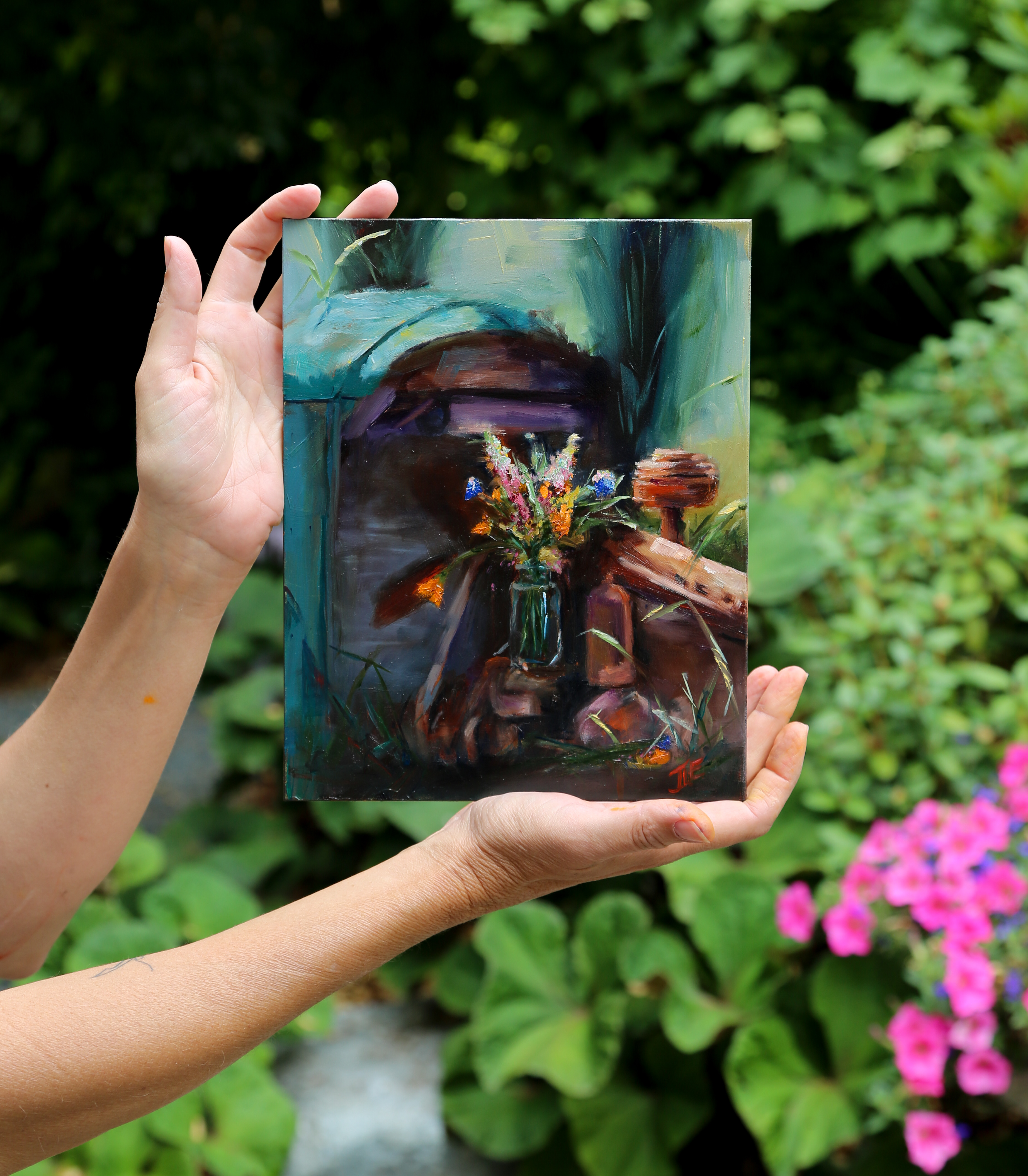 I bought these flowers from Tonnemaker Valley Farm – the flowers are grown in the beautiful Sammamish Valley. I placed them on some antique farm implements during a plein air painting event.