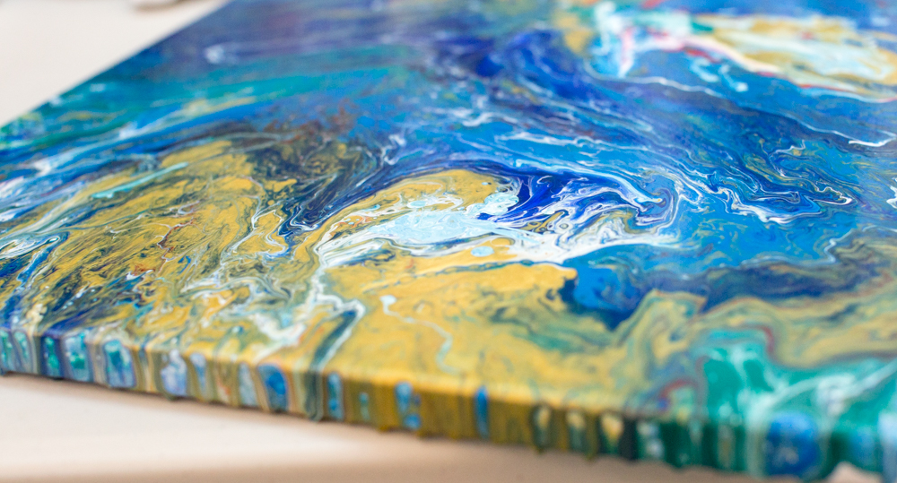 First, I mixed up a solution of 1 part acrylic paint (really any cheap paint is fine) and 3 parts pouring medium. I added a few drops of water so it had the consistency of heavy cream. For every one cup of this mix, I added 3 drops of silicone. I wanted to keep the palette limited, so I mixed up a few ocean colors and one color of a transparent gold acrylic to have the effect of sand. Just for fun, I mixed up a small container of red.